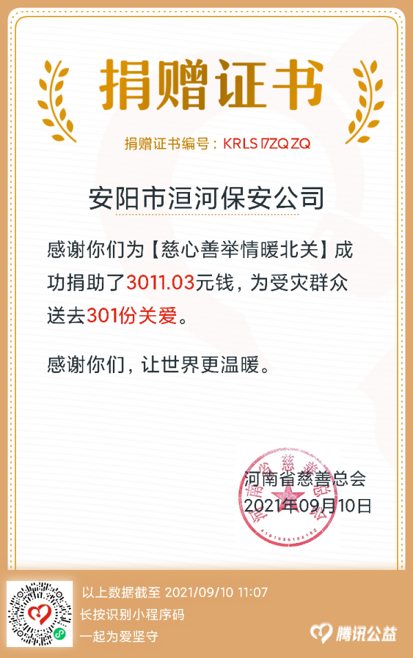 公司黨委書(shū)記王高峰及全體黨委委員帶頭在網(wǎng)上進(jìn)行募捐,全體干部職工積極響應(yīng),紛紛拿出手機(jī),通過(guò)掃碼的形式積極參與募捐活動(dòng),并將該項(xiàng)目轉(zhuǎn)發(fā)至朋友圈、微信群,擴(kuò)大活動(dòng)影響力,動(dòng)員更多的群眾參與捐款。據(jù)統(tǒng)計(jì),9月7日-9月9日三天時(shí)間公司共累計(jì)網(wǎng)絡(luò)捐款3011.03元。
