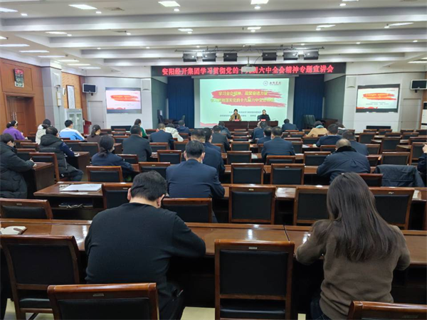 12月14日上午,安陽經(jīng)開集團召開學(xué)習(xí)貫徹黨的十九屆六中全會精神專題宣講會,深入學(xué)習(xí)貫徹習(xí)近平總書記在黨的十九屆六中全會上的重要講話精神和《中共中央關(guān)于黨的百年奮斗重大成就和歷史經(jīng)驗的決議》,特邀請中共安陽市委黨史學(xué)習(xí)教育宣講團成員、安陽學(xué)院黨委委員、宣傳部部長姚林茹進(jìn)行授課,會議由經(jīng)開集團黨委委員、副總經(jīng)理劉志霞主持。洹河保安公司黨委副書記張錫軍帶隊,組織公司15名黨員干部參加學(xué)習(xí)。