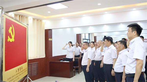 接著,在王高峰同志帶領(lǐng)下,面向鮮紅的中國共產(chǎn)黨黨旗,新、老黨員舉起右拳、莊嚴(yán)宣誓,鏗鏘有力的誓言響徹會場,短短80個字的入黨誓詞,震撼著現(xiàn)場每一位黨員。