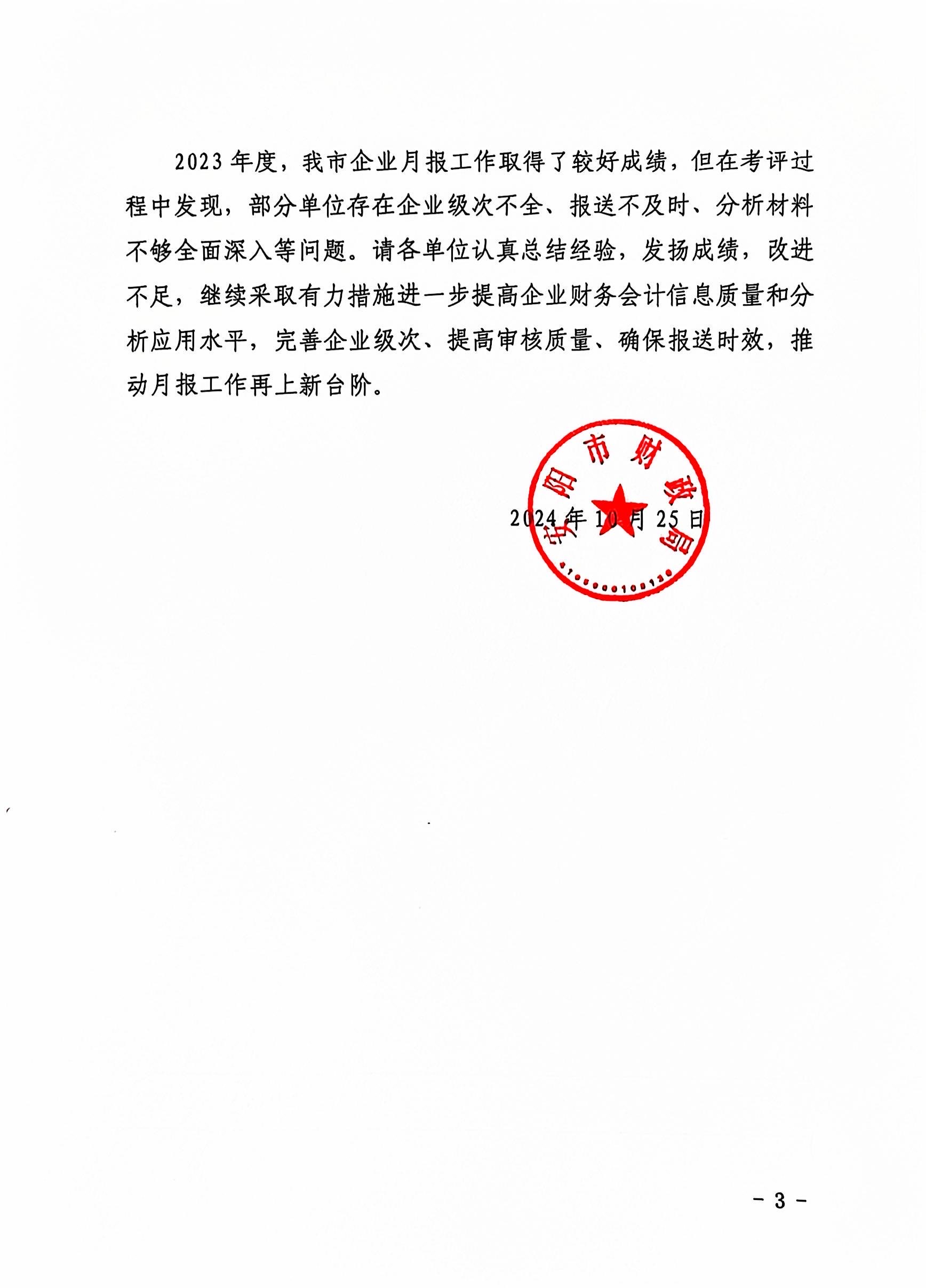 此次通報(bào)表揚(yáng)是對公司財(cái)務(wù)工作的充分肯定,公司財(cái)務(wù)部將繼續(xù)總結(jié)工作經(jīng)驗(yàn),用好報(bào)表數(shù)據(jù),做好情況分析,發(fā)揮經(jīng)濟(jì)效益月報(bào)功能作用,推動(dòng)公司財(cái)務(wù)信息工作再上新臺階。
