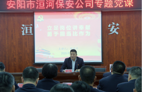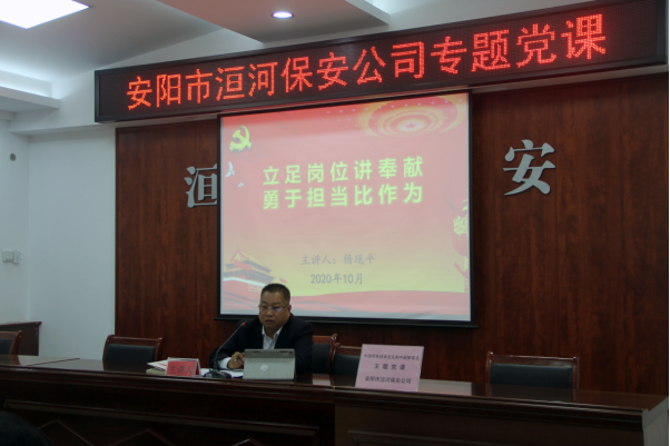 為進一步提升黨員干部的黨性修養(yǎng)與政治素質(zhì),激勵以追求卓越、只爭朝夕的精神,擔當作為、勇于奉獻,努力建設新時代一流保安隊伍。2020年10月30日下午4時,在南二樓會議室,公司黨委組織召開了《立足崗位講奉獻、勇于擔當比作為》專題黨課,黨課由第四黨支部書記楊現(xiàn)平為大家講授。公司黨委書記王高峰,黨委副書記張錫軍,黨委委員高代獻、魏東、楊克忠,總經(jīng)理助理以及各黨支部書記、副書記、入黨積極分子代表40余人聆聽了黨課。黨課由張錫軍同志主持。