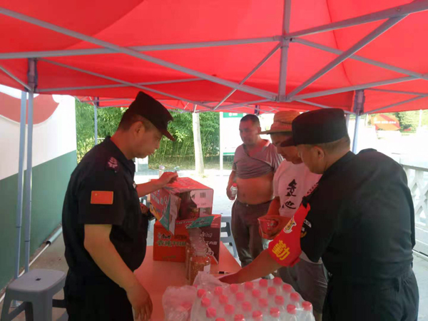由于高溫干旱,防火成為糧庫的首要工作。保安員犧牲休息時間配合中儲糧,聯(lián)合公安、消防等部門開展消防安全大檢查并開展消防安全演練,增強了消防安全意識,提升了消防滅火能力。為確保出入糧庫車輛有序、安全,隊員每天早來晚歸,維護糧庫大門口秩序??吹郊Z農排隊售糧,保安班長馮秋森安排隊員架設愛心涼亭,擺放愛心座椅, 備足熱水、礦泉水等防暑降溫用品,讓糧農使用,防止中暑。他們又準備了方便面分發(fā)到糧農手中,解決他們的用餐。