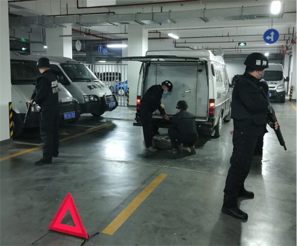 演練現(xiàn)場,一輛運(yùn)鈔車在執(zhí)行押運(yùn)勤務(wù)途中突發(fā)故障,車組人員沉著冷靜、反應(yīng)迅速、措施得當(dāng),整個(gè)過程按照應(yīng)急預(yù)案有序進(jìn)行,達(dá)到預(yù)期效果。
