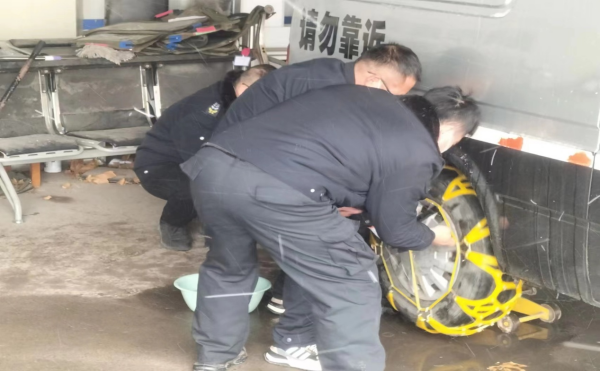 收車后,大隊(duì)長馮文峰帶領(lǐng)各個(gè)車組對(duì)押運(yùn)車輛進(jìn)行全面檢查,查看防滑鏈?zhǔn)欠駬p壞、是否可以正常使用。同時(shí),要求各個(gè)車組訓(xùn)練拆裝防滑鏈,以便遭遇大雪、結(jié)冰天氣可以熟練迅速地安裝。
