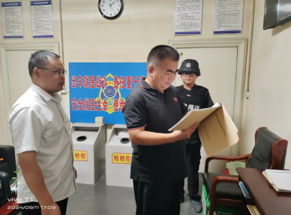 在槍彈庫,韋洪東仔細(xì)查看了槍支領(lǐng)用審批表和槍支彈藥日常使用登記臺(tái)賬等各項(xiàng)工作臺(tái)賬,并對(duì)日常槍支使用安全問題進(jìn)行詳細(xì)詢問,特別強(qiáng)調(diào)要嚴(yán)格遵守公司制度,保證每天押運(yùn)途中的運(yùn)輸安全,確保大隊(duì)押運(yùn)工作安全進(jìn)行。
