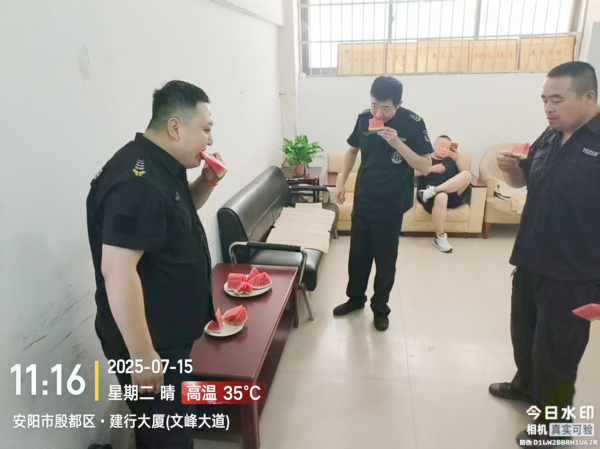 連日來(lái),高溫天氣持續(xù)“烤”驗(yàn)著堅(jiān)守在崗位一線的守押人員。為有效緩解高溫帶來(lái)的不適,保障隊(duì)員們身體健康,7月15日,守押五大隊(duì)特意采購(gòu)了一批新鮮甘甜的西瓜,為堅(jiān)守崗位的隊(duì)員們送去清涼與關(guān)懷。
