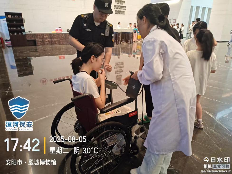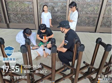 8月5日17時(shí)35分,殷墟博物館南門檢票區(qū),特保隊(duì)員李昊巡邏時(shí),發(fā)現(xiàn)一名女游客突發(fā)暈厥。隨即上前穩(wěn)定游客身體姿態(tài),詢問(wèn)同行的郭女士得知,暈倒者為其女兒,因高溫在等待檢票過(guò)程中突發(fā)身體不適繼而暈厥。