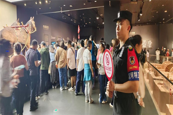 節(jié)日期間,特保大隊(duì)實(shí)行24小時(shí)輪班值守,全體隊(duì)員全情投入安保工作。一是嚴(yán)把入口關(guān)。安檢隊(duì)員嚴(yán)守各場(chǎng)館入口安檢關(guān)口,細(xì)致排查易燃易爆、管制刀具等違禁物品。僅殷墟博物館、中國(guó)文字博物館、漢字公園3處,日均完成超4萬(wàn)余人次安檢,精準(zhǔn)攔截多起違禁品,筑牢“危險(xiǎn)物品不入園”的堅(jiān)實(shí)防線。二是強(qiáng)化內(nèi)部巡邏。館內(nèi)隊(duì)員加密巡邏頻次,既重點(diǎn)盯防文物展柜等安全要害,又聚焦客流易聚集區(qū)域。實(shí)時(shí)疏導(dǎo)擁擠人群,有效防范各類(lèi)安全風(fēng)險(xiǎn)。三是維護(hù)現(xiàn)場(chǎng)秩序。游客熱點(diǎn)區(qū)域,隊(duì)員遇人員飽和時(shí),及時(shí)引導(dǎo)游客分批次有序游覽,保障良好秩序。四是提供暖心幫助。特保隊(duì)員專(zhuān)注引導(dǎo)行人安全通行。遇到老年游客或攜帶重物的游客,主動(dòng)上前攙扶、協(xié)助搬運(yùn)行李,以貼心舉措傳遞安保溫度。