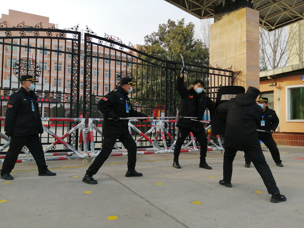 上午9時30分,在疫情防控期間,兩名社會人員不戴口罩要強行進入安陽第五中學校園,保安員對其進行勸阻。但兩人不聽勸告,手持鋼管要沖進學校,并揚言用爆炸物威脅。我保安員立刻啟動防暴防恐應急預案。隊員拿起鋼叉、橡膠棒、防暴盾牌等安保器械與“暴徒”勇敢的搏斗,逐步壓縮暴恐分子活動范圍,并在工學院中隊的配合下將兩人制服。