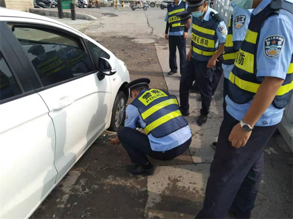 7月24日上午9時許,隊員楊科、李思聰、石玉濤等人,巡邏至文峰路西營街交叉口時,發(fā)現一輛白色轎車的右前輪陷在窨井里,趕忙上前查看情況,應是前幾日暴雨把窨井蓋給沖走了,導致車輛右輪卡在了窨井口。隨后,隊員們有的協(xié)助車主張女士,使用千斤頂把車輛頂起,有的在附近尋找被雨水沖走的窨井蓋。隊員們把找到井蓋放回原位,幫助車主安全離開,車主張女士一再表示感謝。