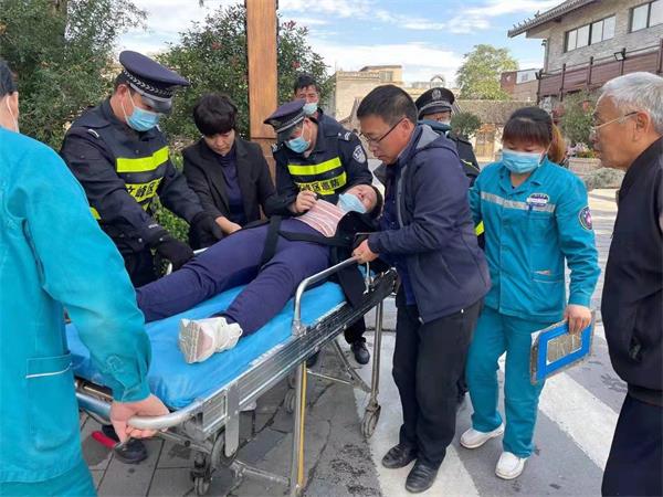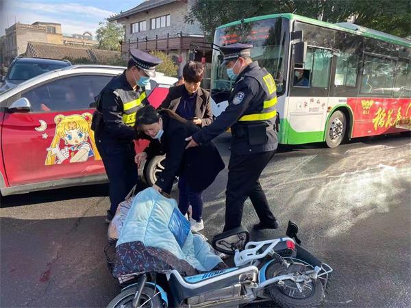 10月11日上午9時許,人防一大隊文峰巡防中隊班長楊科,隊員鄭天龍,王軍清等9名隊員,例行巡邏到文峰北路與三道街交叉口時,路上突發(fā)一起交通事故,事故導致一名婦女摔倒在地,見此情形,隊員及時停車上前查看情況。
