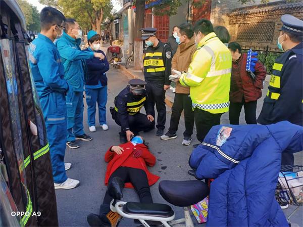 早上7點(diǎn)50分許,巡防隊(duì)員王軍清、梁子力,完成學(xué)校護(hù)校崗安保任務(wù)后,在返回單位途中,發(fā)現(xiàn)文峰北路與三道街交叉口車輛行駛極其緩慢,造成道路擁堵。王軍清立即下車查看,原來是一輛轎車與一輛電動車發(fā)生碰撞,導(dǎo)致電動車側(cè)翻倒地,一名約70歲的老人摔倒在地,見此情形,執(zhí)勤隊(duì)員連忙上前詢問查看,發(fā)現(xiàn)該老人表情痛苦,外觀有輕微傷。