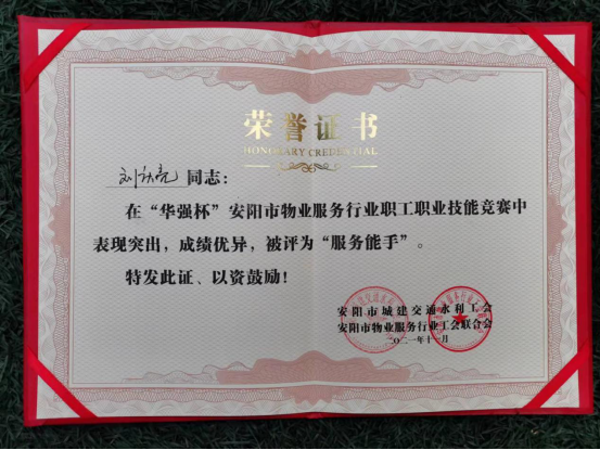 11月16日上午,在華強(qiáng)城隆重舉行的2021年安陽市物業(yè)服務(wù)行業(yè)職工技能“華強(qiáng)杯”競(jìng)賽中,鼎誠物業(yè)公司榮獲2021年“華強(qiáng)杯”安陽市物業(yè)服務(wù)行業(yè)職工技能競(jìng)賽“優(yōu)秀組織獎(jiǎng)”。劉慶亮、康長(zhǎng)青獲得“服務(wù)能手”獎(jiǎng);蘇俊強(qiáng)、康長(zhǎng)青獲得“優(yōu)秀選手”稱號(hào)。
