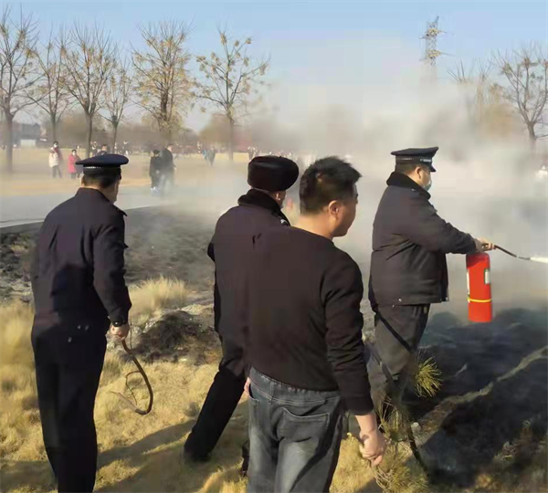 2月19日下午4點(diǎn),人防四大隊(duì)殷都區(qū)文廣新局保安班長(zhǎng)王俊峰和隊(duì)員郝彥軍像往常一樣,按照規(guī)定的線路執(zhí)行安保巡邏,當(dāng)他們?cè)谝笮骈T口巡邏執(zhí)勤時(shí),發(fā)現(xiàn)殷墟廣場(chǎng)前草坪上冒起濃濃黑煙,有火險(xiǎn),他們隨即趕到火險(xiǎn)現(xiàn)場(chǎng),班長(zhǎng)王俊峰和郝彥軍隨手撿起地上的木棍進(jìn)行滅火,王俊峰通知郝彥軍趕快上報(bào)殷墟警務(wù)室,殷墟警務(wù)室王隊(duì)長(zhǎng)得知后,立即帶領(lǐng)警務(wù)室所有隊(duì)員拿著滅火器趕到現(xiàn)場(chǎng)進(jìn)行滅火。由于發(fā)現(xiàn)及時(shí),在大家的共同努力下,將草坪上的明火撲滅。