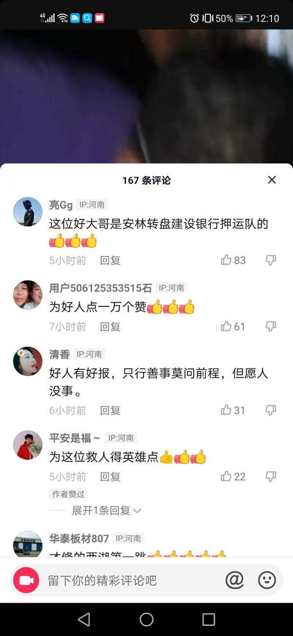 6月6日晚10時(shí)30分左右,韓海根、劉玉峰、張彩軍、徐現(xiàn)強(qiáng)等四人下班后前往林州龍湖散步遛彎。當(dāng)行至涼亭下面時(shí),他們聽見“撲通”的落水聲,韓海根隱約看到附近的一位紅衣女子跳下了龍湖,他們借著夜色發(fā)現(xiàn)該女子在水里掙扎,此時(shí),韓海根、劉玉峰、張彩軍、徐現(xiàn)強(qiáng)四人迅速趕到落水點(diǎn)查看情況,旁邊已經(jīng)有路人在圍觀,但卻沒人下去營救,此時(shí),隊(duì)員徐現(xiàn)強(qiáng)立即跳下去前去營救,韓海根、劉玉峰、張彩軍打開手機(jī)電源為其進(jìn)行照明指揮,經(jīng)過大家的努力,成功將落水女子救了上來。此時(shí)有路人已經(jīng)撥打了120和報(bào)警電話,救護(hù)車趕到后,四人合力又將落水女子抬上了救護(hù)車,路邊的群眾紛紛為其四人的行為點(diǎn)贊,并被路邊群眾拍攝視頻上傳到了抖音上,贊揚(yáng)他們弘揚(yáng)了社會(huì)正氣,傳遞了社會(huì)正能量,為四人的挺身而出和俠義之舉點(diǎn)贊。