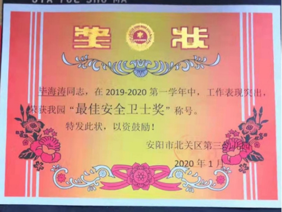獲獎隊員中,駐北關(guān)區(qū)區(qū)直幼兒園張強在2019年度“不忘初心 花開綻放 美麗北幼人”評選活動中,榮獲“美麗奉獻(xiàn)獎”;駐北關(guān)區(qū)博雅幼兒園常保安在“美麗博雅人”評選中,被評為“杰出奉獻(xiàn)獎”;駐北關(guān)區(qū)第三幼兒園畢海濤榮獲“杰出安全衛(wèi)士獎”稱號。自該大隊擔(dān)負(fù)北關(guān)區(qū)教育系統(tǒng)安全保衛(wèi)工作以來,駐各小學(xué)、幼兒園保安員夯實保安技能,開展應(yīng)急處置預(yù)案演練,認(rèn)真履行職責(zé),為創(chuàng)建平安校園做出了突出貢獻(xiàn)。