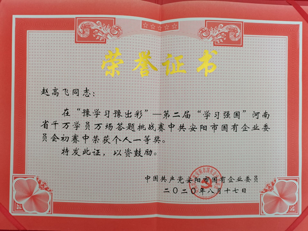 對于平時怎樣學(xué)習(xí),趙高飛有自己的學(xué)習(xí)心得,他認(rèn)為,學(xué)習(xí)要貴在勤奮、貴在鉆研、貴在有恒,每天早上第一件事,就是打開學(xué)習(xí)強國平臺,翻閱感興趣的時事新聞和行業(yè)動態(tài),完成每天的學(xué)習(xí)任務(wù),從不占用工作時間學(xué)習(xí),都是在上班之前就完成了。對于參加比賽如何獲得好的成績,趙高飛有一套自己的學(xué)習(xí)竅門。一是要堅持,每天堅持把當(dāng)日學(xué)習(xí)積分做完,總結(jié)學(xué)習(xí)方法和學(xué)習(xí)技巧。二是勤練習(xí),四人賽、雙人對戰(zhàn)是關(guān)鍵,要勤練習(xí)各個答題模塊,熟能生巧。三是有訣竅,他整理出一整套學(xué)習(xí)題庫達(dá)5000多題,并利用碎片時間翻看熟記于心,他把各種類型的題分類總結(jié),錯題、易錯題收藏起來,反復(fù)練習(xí)、各個擊破,最終,他克服一切困難,集中一切精力用5個小時時間,通關(guān)“強國總題庫”共4202題。四是重交流,他加入了“學(xué)習(xí)強國”全國學(xué)習(xí)聯(lián)盟、“學(xué)習(xí)強國”河南學(xué)習(xí)聯(lián)盟等學(xué)習(xí)微信群,和學(xué)習(xí)達(dá)人們一起探討答題經(jīng)驗和技巧
