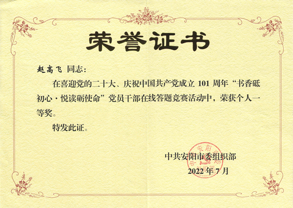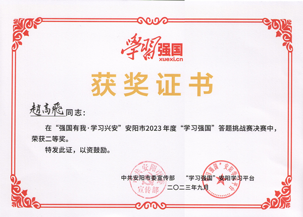 趙高飛,35歲,中共黨員,本科學(xué)歷,現(xiàn)任鼎信子公司副經(jīng)理,自“學(xué)習(xí)強國”平臺上線以來,趙高飛學(xué)習(xí)成績屢創(chuàng)新高,先后榮獲2020年度學(xué)習(xí)強國挑戰(zhàn)賽安陽市賽區(qū)決賽“個人三等獎”,2021年度安陽市黨員干部在線答題競賽“個人三等獎”,2022年度學(xué)習(xí)強國河南學(xué)習(xí)平臺“喜迎二十大、中原更出彩”答題比賽“周達(dá)人”及“學(xué)習(xí)達(dá)人”,2023年度“強國有我 學(xué)習(xí)興安”學(xué)習(xí)強國答題挑戰(zhàn)賽安陽市決賽“個人二等獎”,2023年度學(xué)習(xí)強國河南學(xué)習(xí)平臺“貫徹二十大精神、建設(shè)現(xiàn)代化河南”強國答題比賽“周達(dá)人”。學(xué)習(xí)從來都不是一蹴而就的,這些成績的獲得,是趙高飛日積月累堅持學(xué)習(xí)的成果。