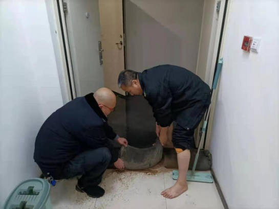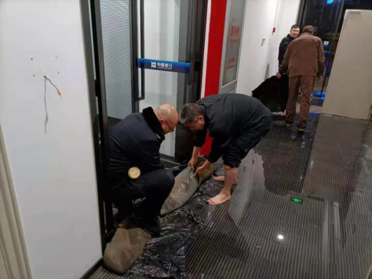 看到水還在通過(guò)破裂的管道不斷涌出,辦公室和走廊已經(jīng)有了積水,已經(jīng)危及到辦公用品的安全。值班隊(duì)員不顧寒冷,立即行動(dòng)起來(lái),與中原銀行物業(yè)人員投入搶險(xiǎn)。隊(duì)員趙紅、王勇一方面把已經(jīng)有積水的辦公室中的物品搬運(yùn)出來(lái),另一方面迅速用沙袋擋在辦公室門口,阻止流水進(jìn)入,并用掃把等工具清理積水;趙紅更是脫掉鞋,光著腳,泡在寒冷刺骨的水中,清理積水,減少損失。物業(yè)人員則從管道破裂處,接上臨時(shí)管道把水引向樓外。經(jīng)過(guò)一個(gè)小時(shí)的奮戰(zhàn),辦公室和樓道內(nèi)的積水終被清理完畢。