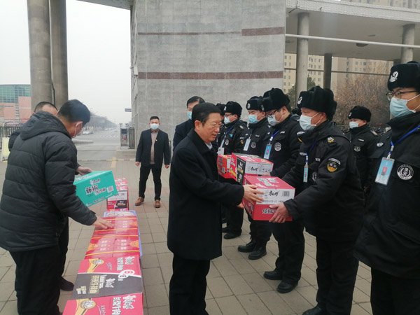1月15日上午,安陽工學院校長景國勛一行,帶著方便面、蘋果、橘子等慰問品,來到人防三大隊派駐工學院保安班駐地慰問堅守在一線執(zhí)勤的隊員。人防三大隊領導王武魁、聶紹軍、閆永勝參加了慰問活動。