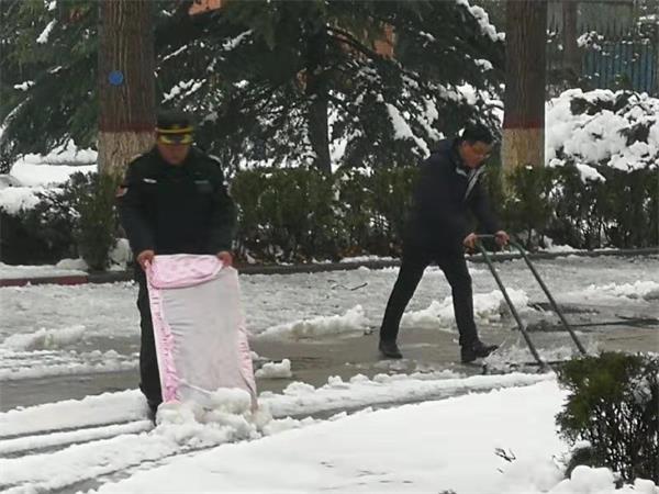 為盡快消除積雪給學(xué)校道路交通帶來的諸多不便,各個班組接班的隊員提前到崗,下班的隊員晚點(diǎn)下班,投入掃雪工作。雖然天氣有點(diǎn)冷,但是大家全然不顧,一個個爭先恐后,各個駐學(xué)校的保安揮動著手中的鐵鍬、大掃帚,配合默契、干勁十足,齊心協(xié)力,鏟的鏟、推的推、掃的掃。經(jīng)過近一個小時的奮戰(zhàn),學(xué)校主要區(qū)域的雪已被清除干凈。