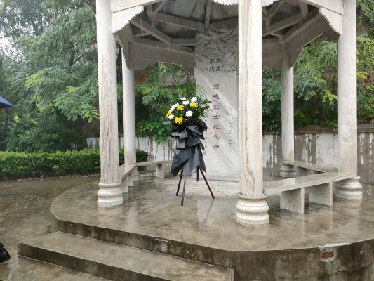 活動當(dāng)日,盡管天空的雨越下越大,但黨員們風(fēng)雨無阻,踏著水來到英烈村萬感烈士紀(jì)念碑亭前,冒雨向紀(jì)念碑上鐫刻犧牲的41位烈士敬獻(xiàn)鮮花、行鞠躬禮、寄托哀思。